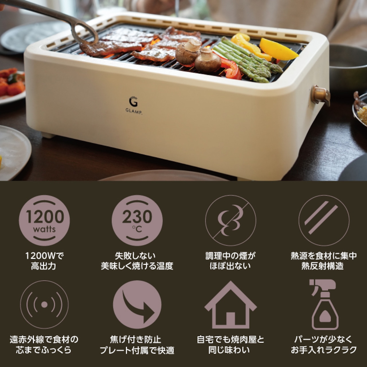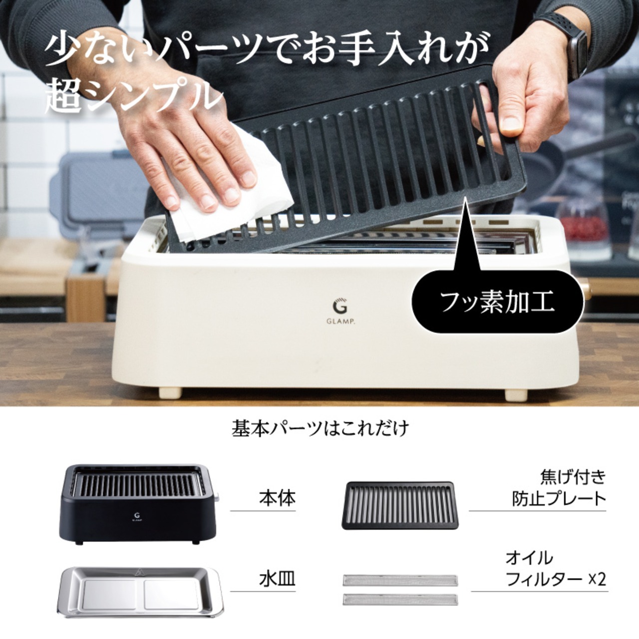 GLAMP.超少煙 グリル ブラックホワイトグランプ glamp グリル 煙が少ない 煙が出ない 焼肉グリル ホットプレートヘルシー 脂が落ちる 脂分カット 油脂カット 遠赤外線 輻射熱 炭火焼 七輪 お手入れ簡単 フッ素加工 テフロン加工 焼き肉 焼鳥 焼き鳥 ステーキ。
