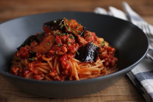 トマト缶で作る。なすとひき肉のボロネーゼ。