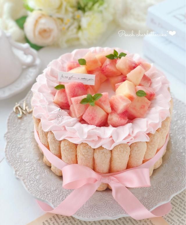 桃のグラサージュケーキ🍑🎂 今回は旬の桃を使って可愛らしくグラサージュケーキを作りました👩🍳 中身は白桃と黄桃が入ってます✨クリームチーズを混ぜた生クリームでナッペして、いちご風味のグラサージュをタラっと🍓 白桃の変色防止のため、前日に湯むきして。
