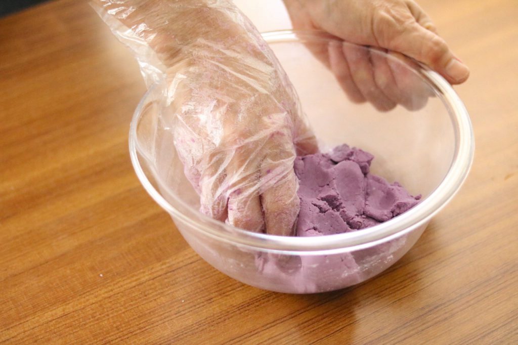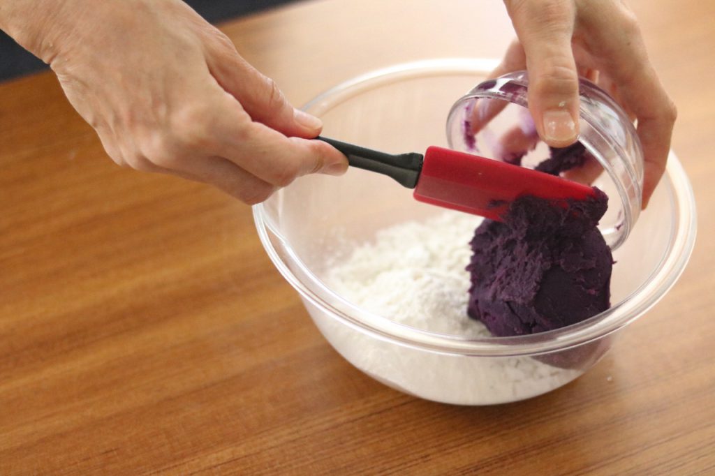 時短でできる! 芋くずを使ったおやつ「ンムクジプットゥルー」 強火で手早く混ぜ続ける 沖縄料理レシピありんくりん沖縄料理レシピ ありんくりん沖縄タイムス+プラス。