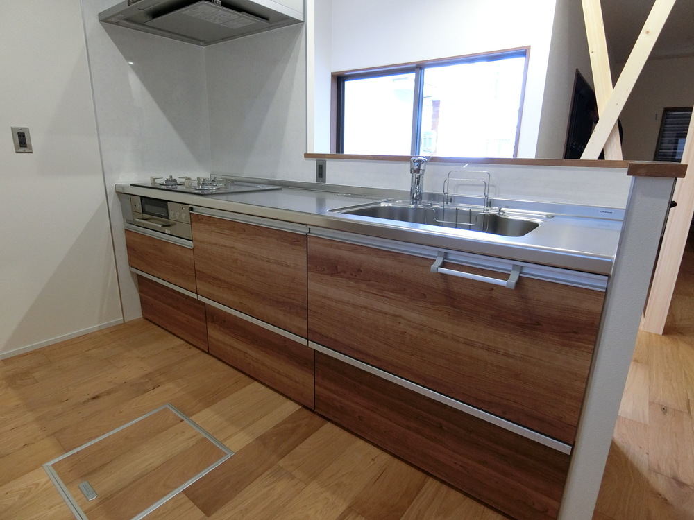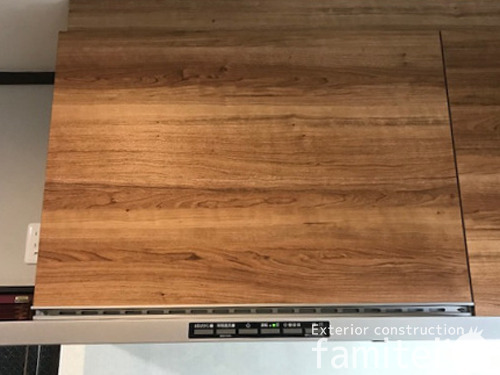ラクエラ カフェウッドブレンド おしゃれな木目柄の対面キッチン。