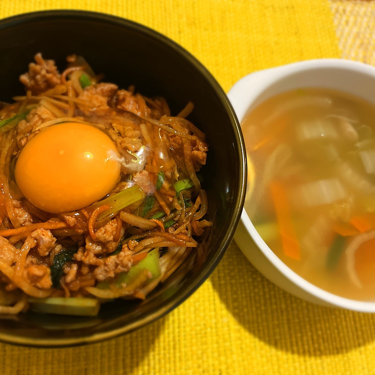 「半熟卵入りビビンバ丼」、春キャベツの春雨みそスープ 3人分。
