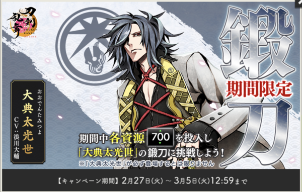 2024年2月 刀剣乱舞「大典太光世 おおでんたみつよ」レシピ・鍛刀時間 3 5まで: ※非公式 刀剣乱舞 とうらぶ 攻略速報。