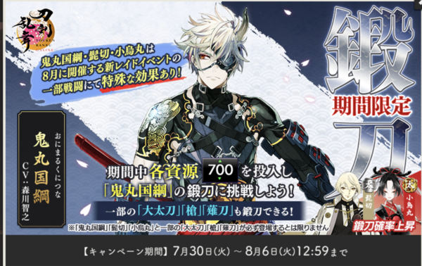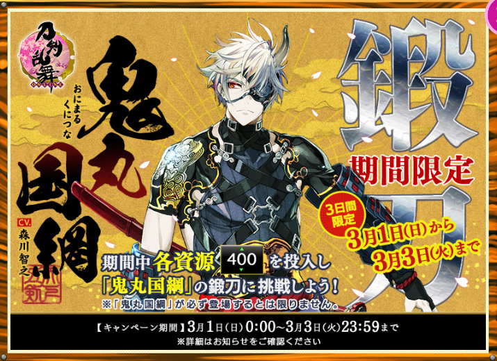 刀剣乱舞 鬼丸国綱 鍛刀レシピや鍛刀結果の報告!20 03 01〜東条りんのブログ。