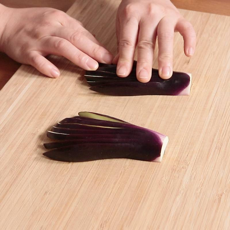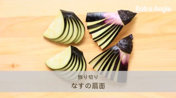 なすを天ぷら用に切る方法2つとコツ 末広 扇 の切り方 和食の野菜飾り切り日本料理、会席・懐石案内所。