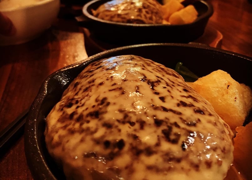 ハンバーグ &ガーリックソース Hamburg Steak with Garlic Sauce。
