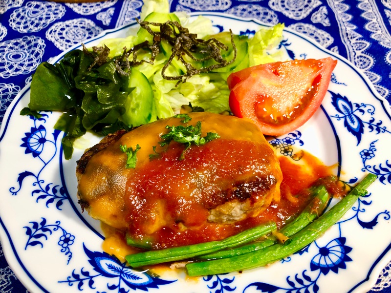 チーズハンバーグのガーリックトマトソースがけ 副菜には白子と鶏手羽元のミニ鍋、なぜか - 糖質オフのおうちごはん~持病があっても楽しく生きる~。