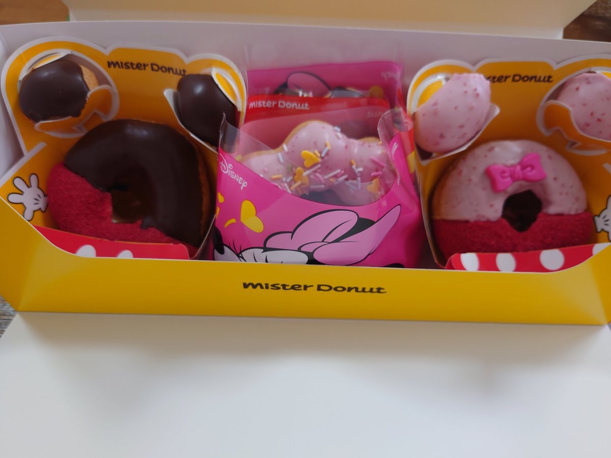 R on X: "ありがとうございます🧸✨ ミスド×ディズニーのコラボ、可愛すぎて食べるのもったいない〜🥹💓ミニーちゃんのリボン付きドーナツや、ミッキー型のポンデリングもあってテンション上がる🍩🎀 見た目だけじゃなくて、味もしっかり美味しいのがさすがミスド。