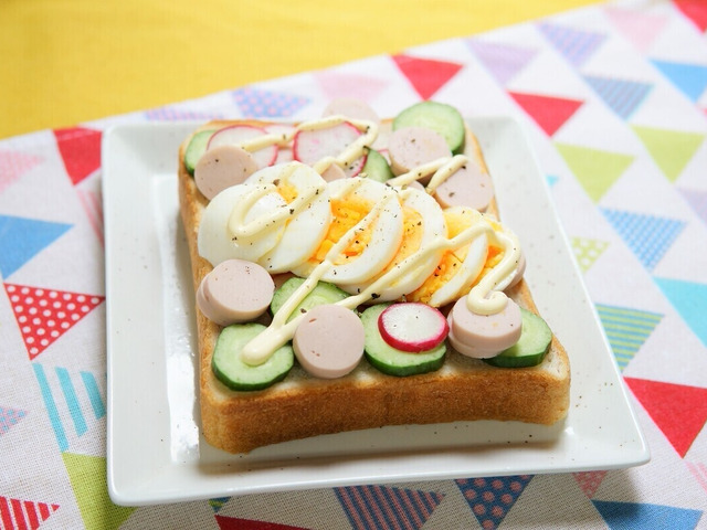 野菜と魚肉ソーセージの水玉オープンサンド。