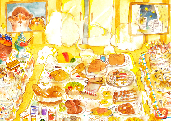 絵本挿絵:たくさんの美味しそうな食べ物が並ぶ部屋水彩画のイラスト,かわいいのイラスト,ほのぼののイラスト,ほ乳類のイラスト,子供・女のイラスト ,お菓子・スイーツのイラスト,飲み物のイラスト,料理のイラストSkillots。