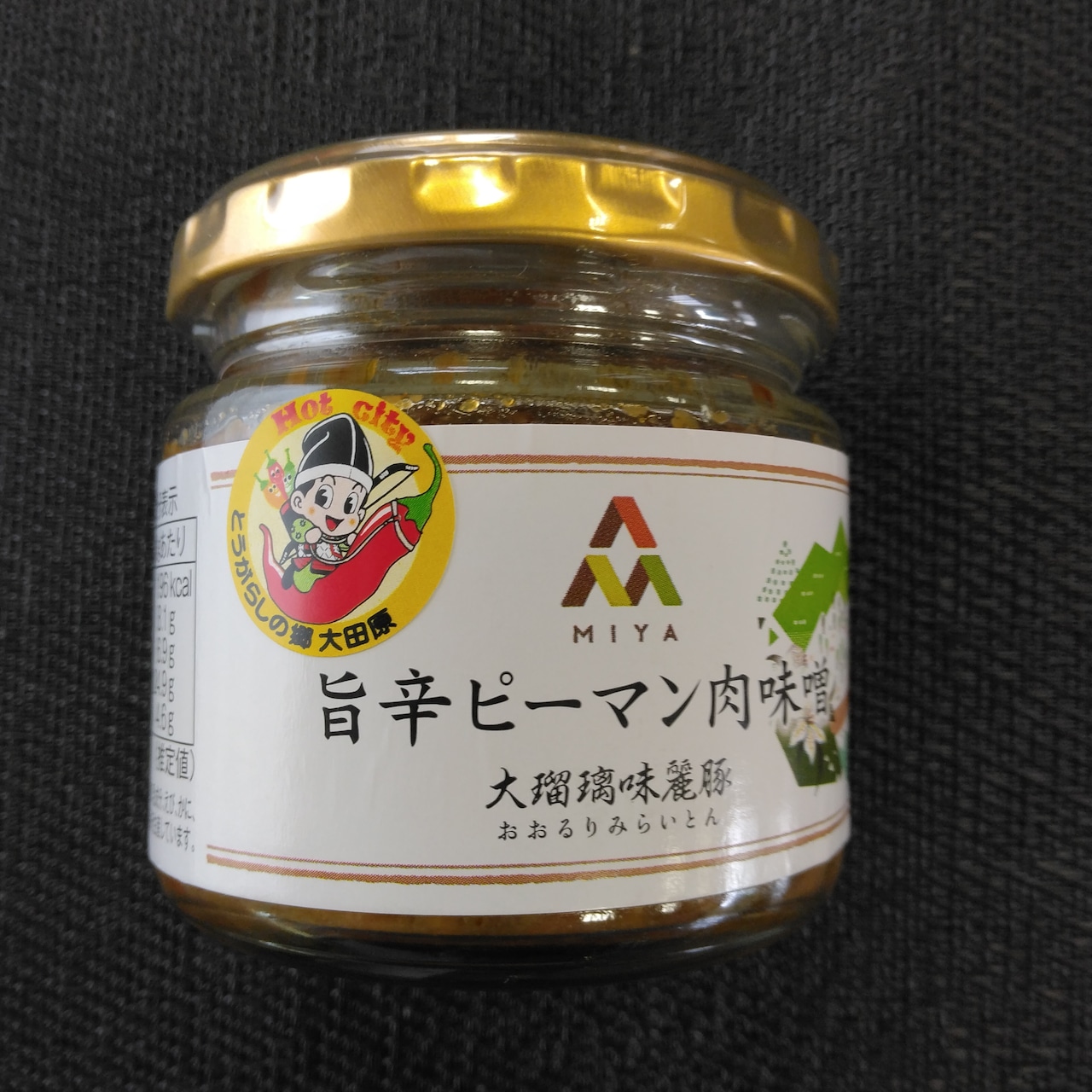 大瑠璃味麗豚入り旨辛ピーマン肉味噌 大田原産栃木三鷹の唐辛子使用ミヤ商事。