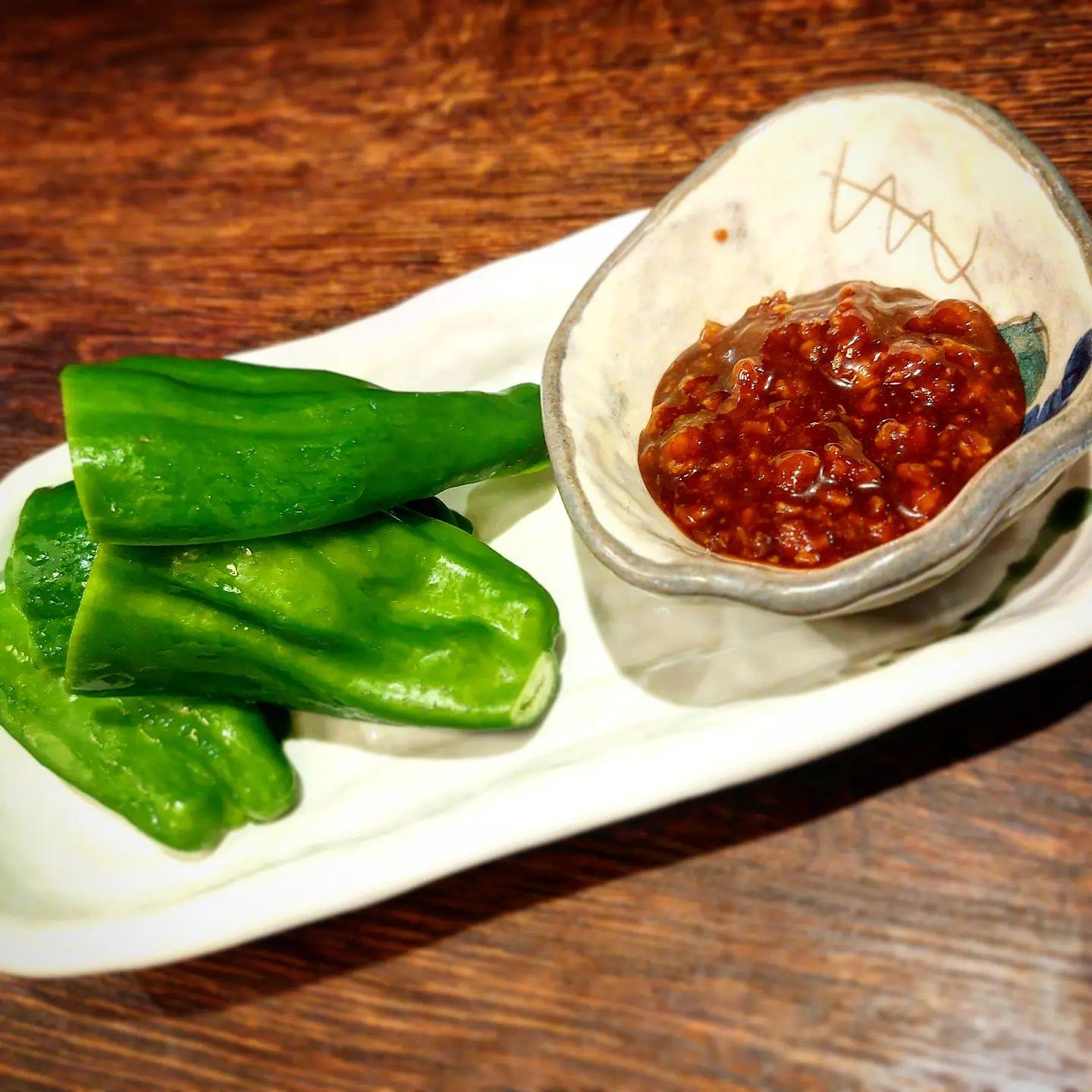 一品料理のご紹介✨ 「肉みそピーマン」 当店の隠れた人気商品です🫑 生のピーマンに自家製の肉みそを詰めた一品で シンプルな料理ながらピーマンの苦味と肉みその辛みが絶妙にマッチした お酒にもよく合う、大人向けの味となっています🍺。