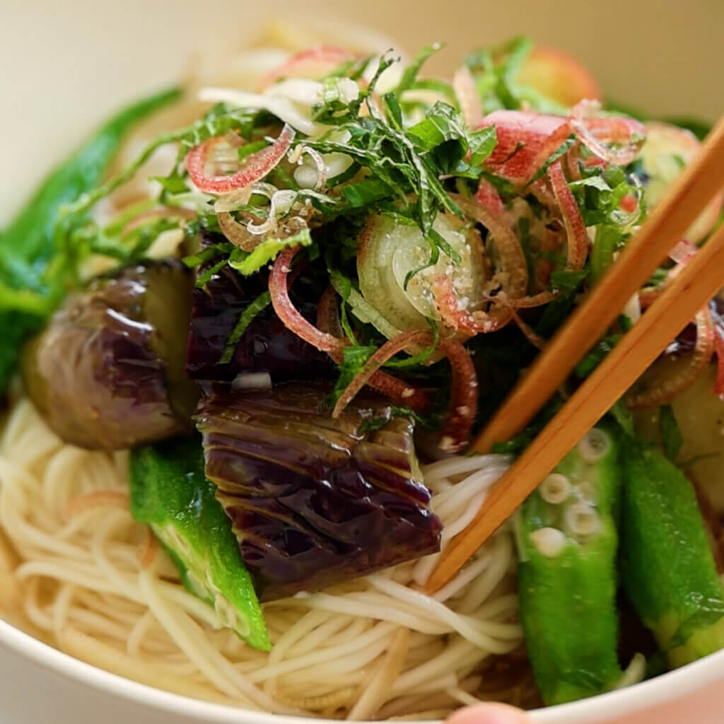 白だしとお酢でさっぱり◎なすとオクラの揚げ浸し。