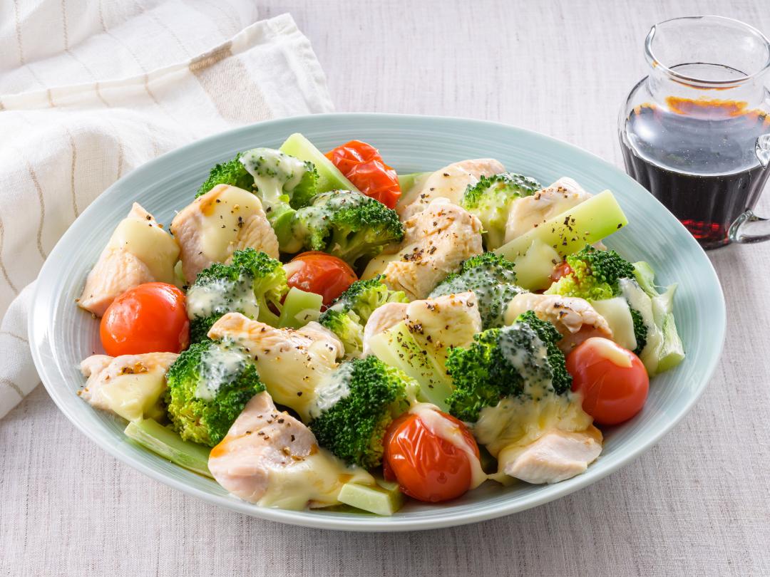 チーズでしっとり!丸ごとブロッコリーと鶏むねのレンジ蒸し。
