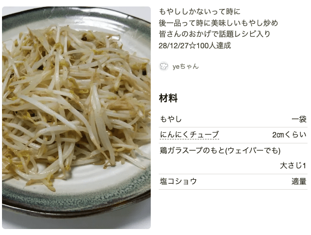 もやし人気レシピ1位「安いもやしを使い倒そう!もう節約レシピなんて言わせない」 殿堂入りつくれぽ1000越え クックパット夕食のおかず.com。