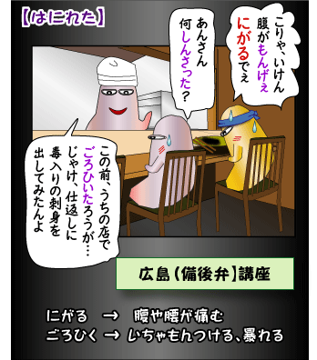 広島弁95 「にがる」 痛む身体内部で、苦しさ、気持ち悪さを伴っている感じはにれたby れたすはうす。