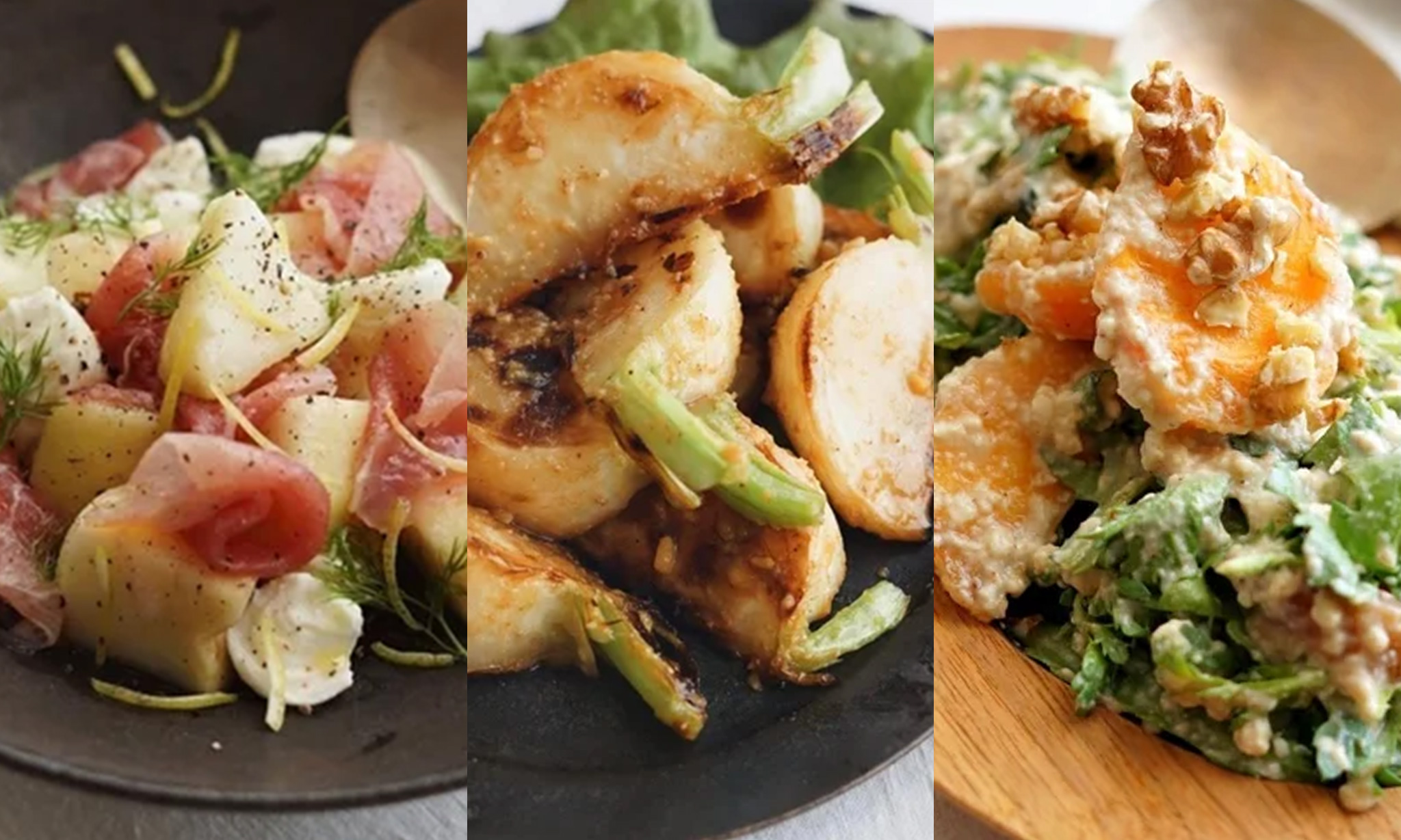 三種のおつまみレシピ「洋梨カプレーゼ」「焼きカブのごま味噌あえ」「春菊と柿の白あえ」アイスム。
