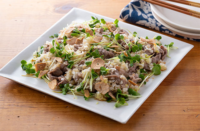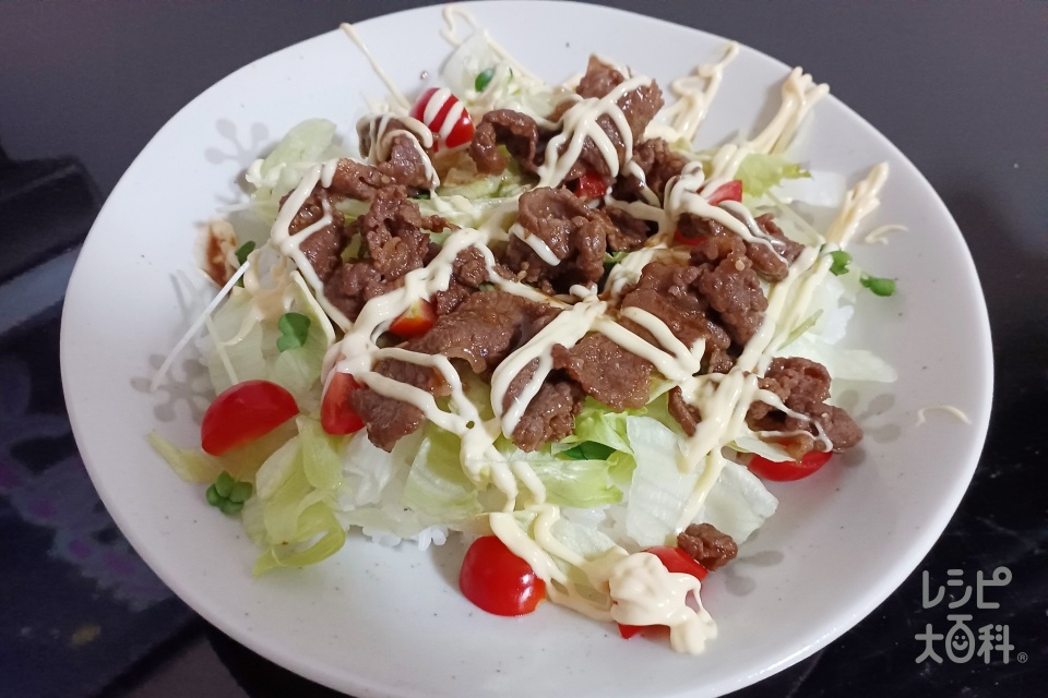 一口食べたら止まらない♪ 牛肉のガリバタ丼。