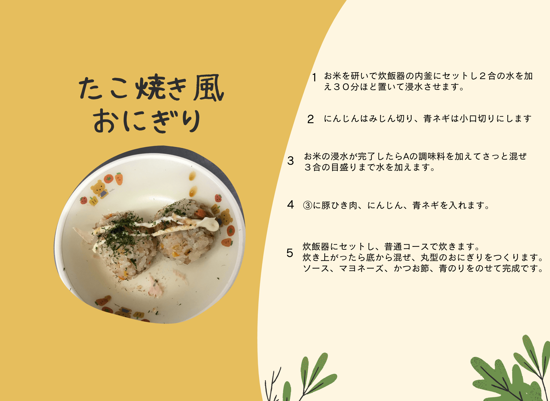 栄養士が考えた幼児食レシピ「ぱる☆キッズごはん」12月号おにぎりをかわいくアレンジ「たこ焼き風おにぎり」生活協同組合 パルシステム東京。
