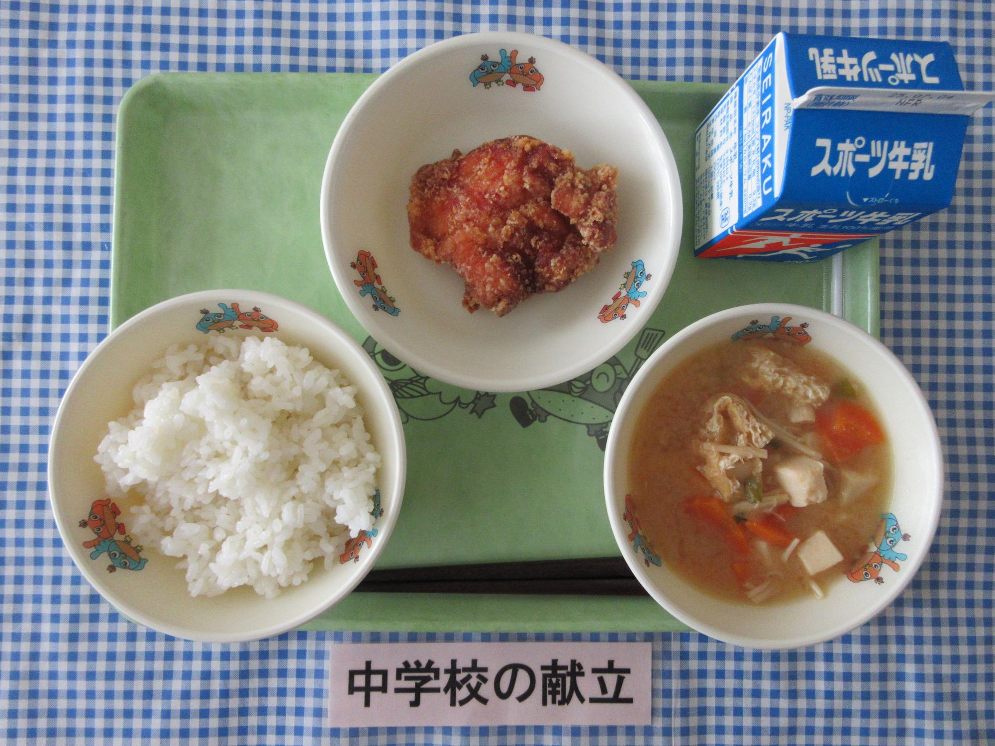 ごはん、豆腐とえのきのみそ汁、鶏肉のからあげ、牛乳 6月24日日高市ホームページ。