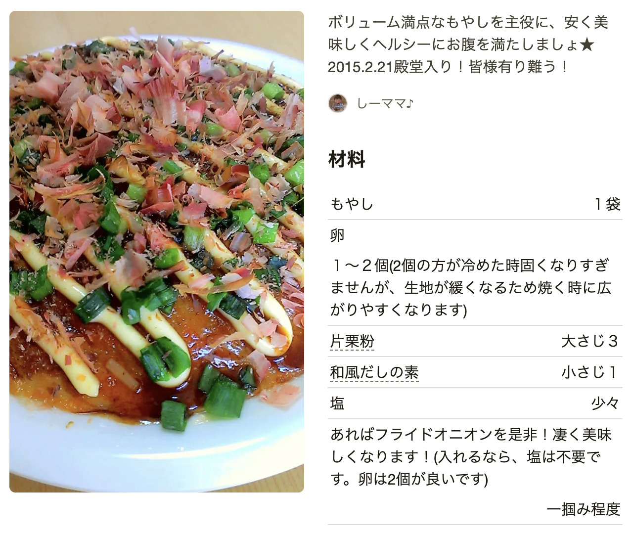もやし人気レシピ1位「安いもやしを使い倒そう!もう節約レシピなんて言わせない」 殿堂入りつくれぽ1000越え クックパット夕食のおかず.com。