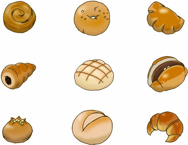 フリーイラストメロンパン、クリームパン、チョココロネ、チーズパンなどの菓子パンのセットパブリックドメインQ:著作権フリー画像素材集。