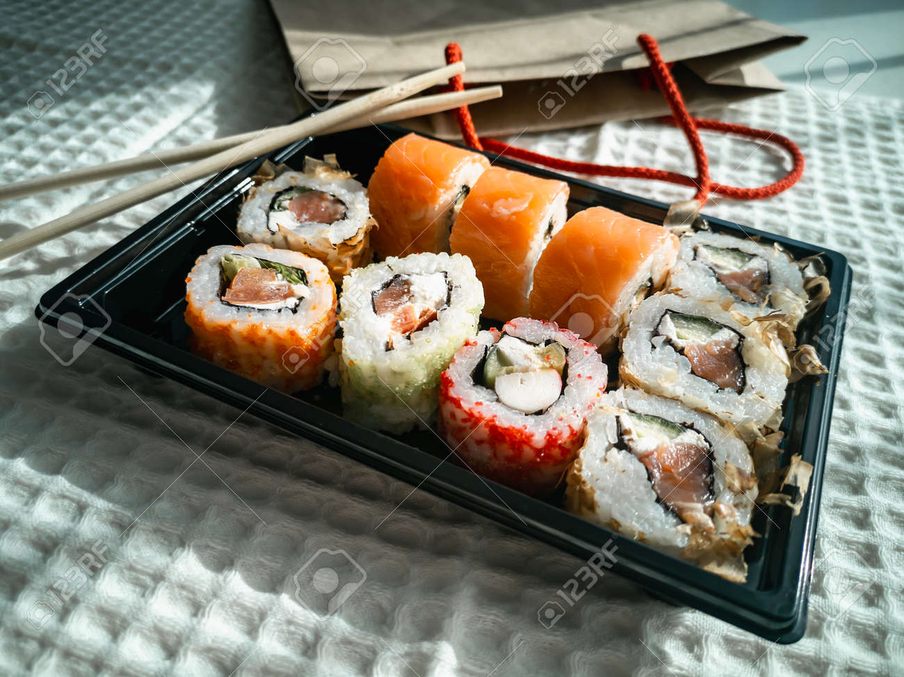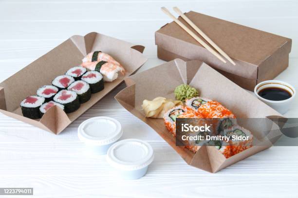 전통적인 일본 음식 초밥 열 상자에 초밥 배달 초밥 니기리 마키 세트 맛있는 저녁 식사 또는 점심 식사 1 인 0명에 대한 스톡 사진및 기타 이미지 - iStock。