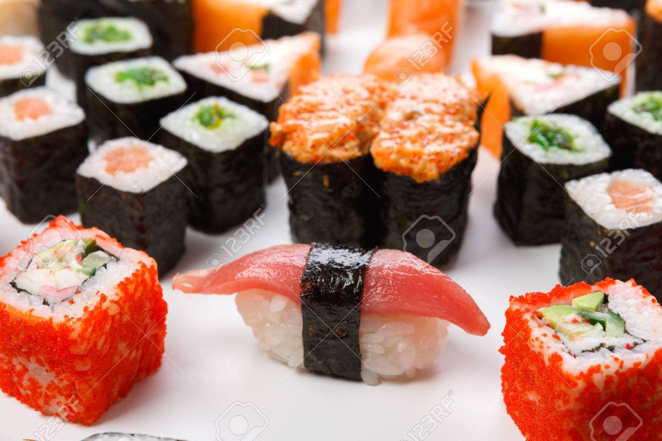 일본 음식 레스토랑 배달-스시 마키, 우나기, 참치와 캘리포니아 롤 큰 파티 플래터 세트 흰색 배경, 근접 촬영에 고립 로열티 무료사진, 그림, 이미지 그리고 스톡포토그래피. Image 93154865。