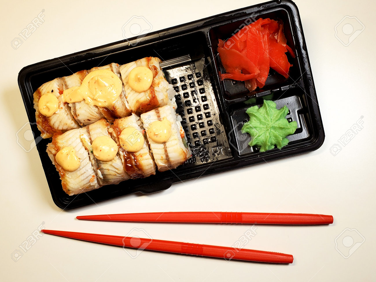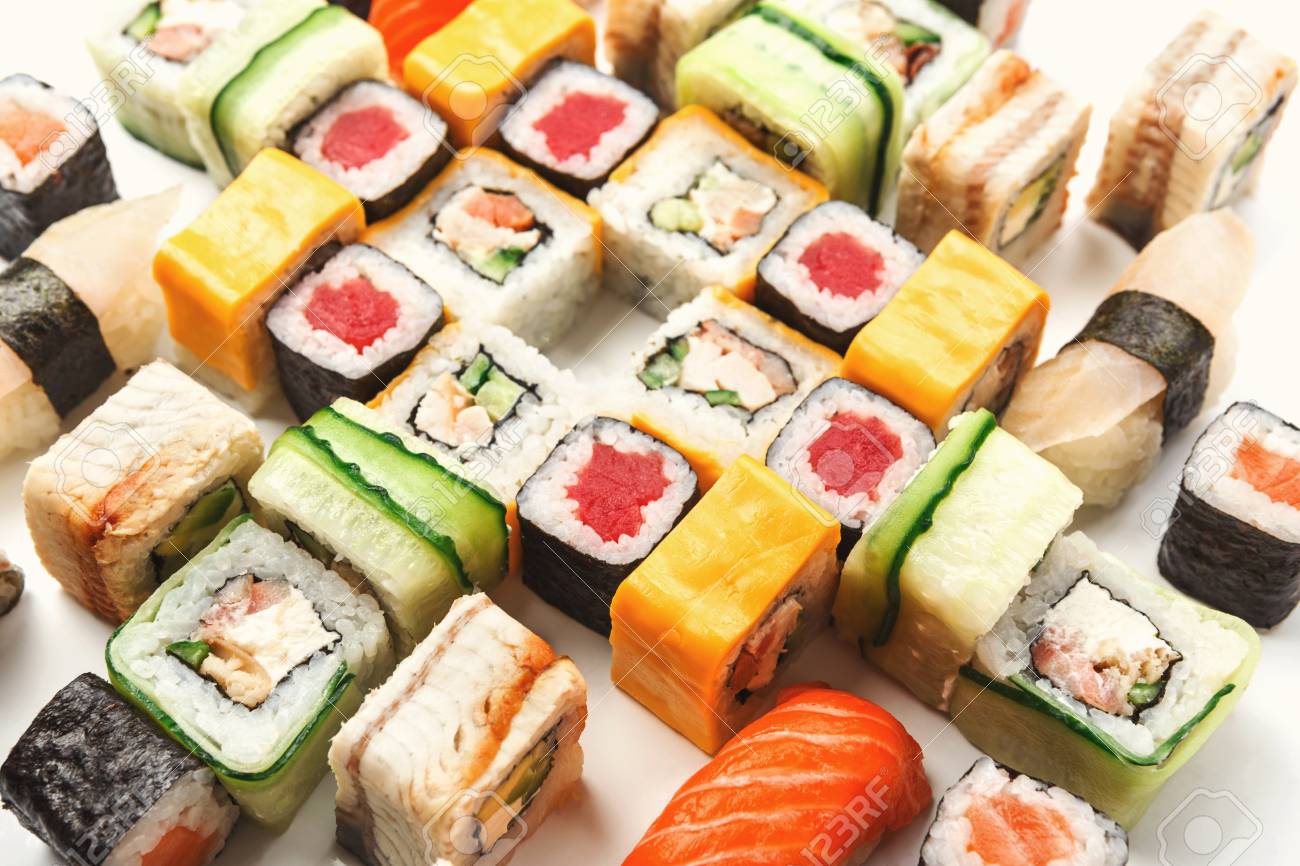 전통적인 일본 음식 배달. 롤, Gunkan와 흰색 배경에서 초밥을 설정하는 초밥의 근접 촬영 로열티 무료 사진, 그림, 이미지 그리고스톡포토그래피. Image 82115868。