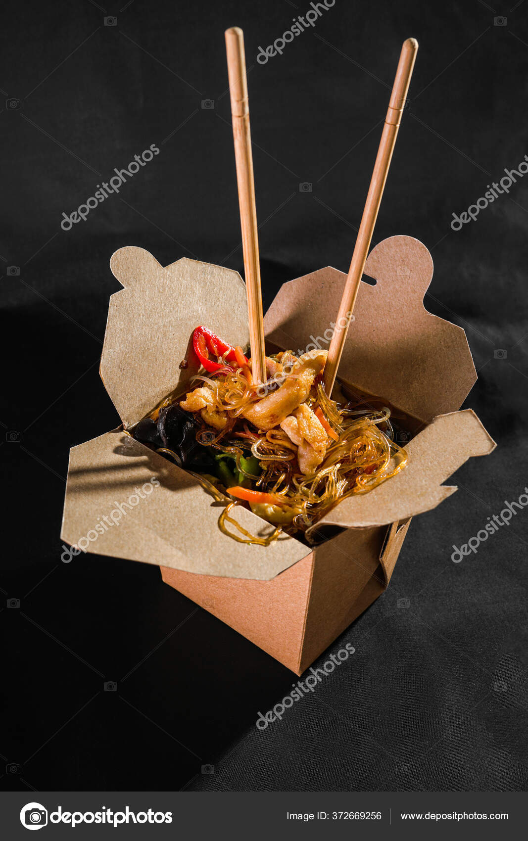 음식을 집에서 배달합니다 해산물 국수는 바탕에 음식이든 상자를 놓는다 — 스톡 사진 © ruseyskiy372669256。