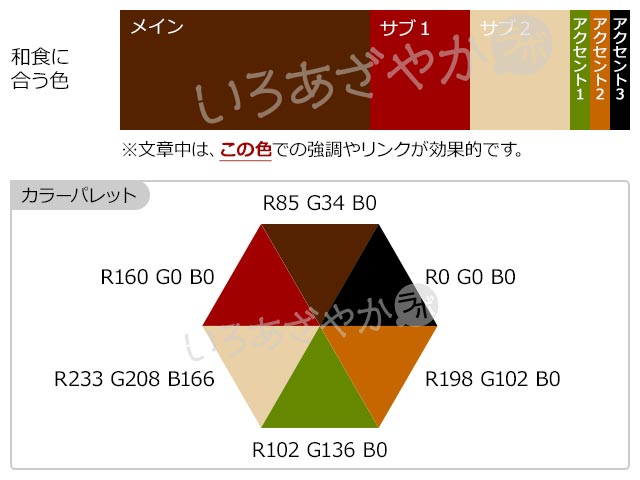 茶色 「和食」をおいしく表現する配色中小企業のホームページ・ECサイトの改善、企画デザインの「いろあざやかラボ」。