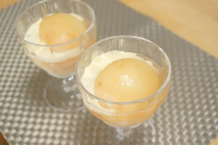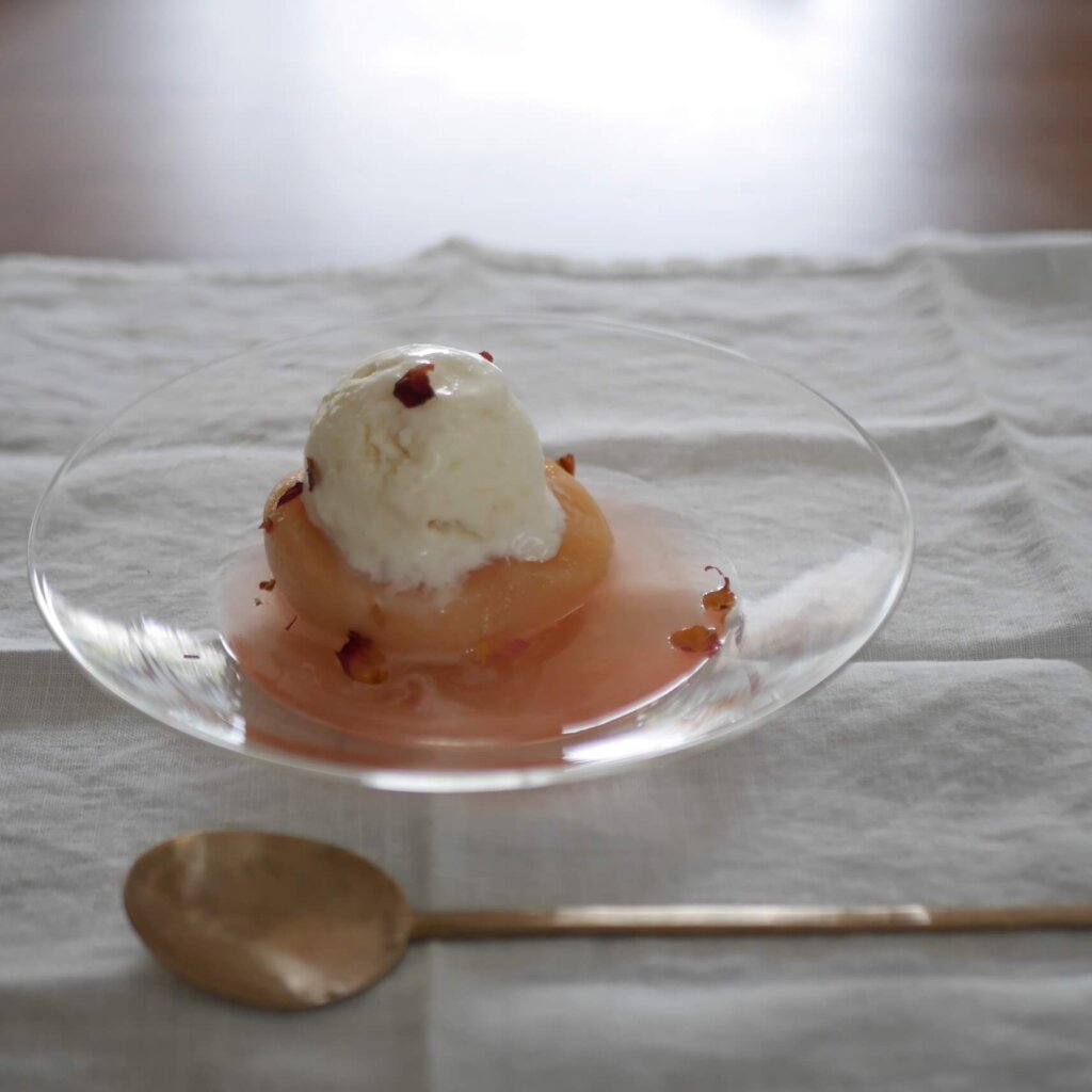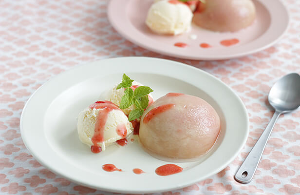 桃のコンポート ピーチメルバ風 ・スイーツ本みりんレシピ全国味淋協会。