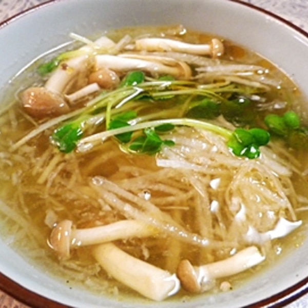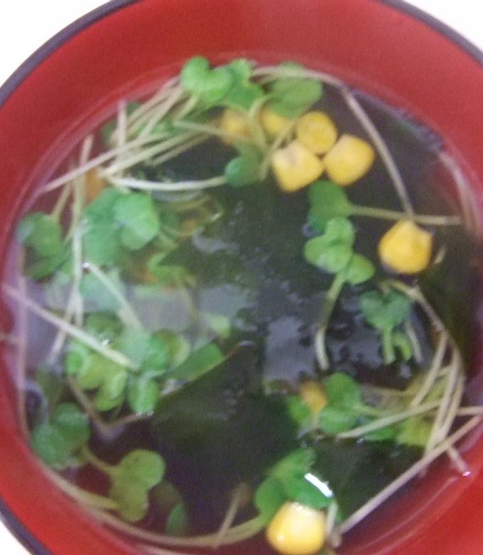 レンジで❤しめじとかいわれ大根とコーンのスープ❤。