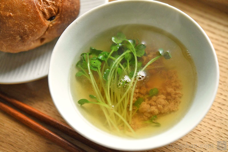 常備菜で手軽に!鶏そぼろとかいわれ大根のスープ:白ごはん.com。