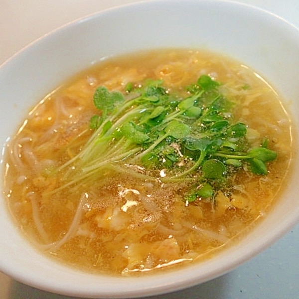 かいわれ大根のせてえのき茸と卵の中華スープ。