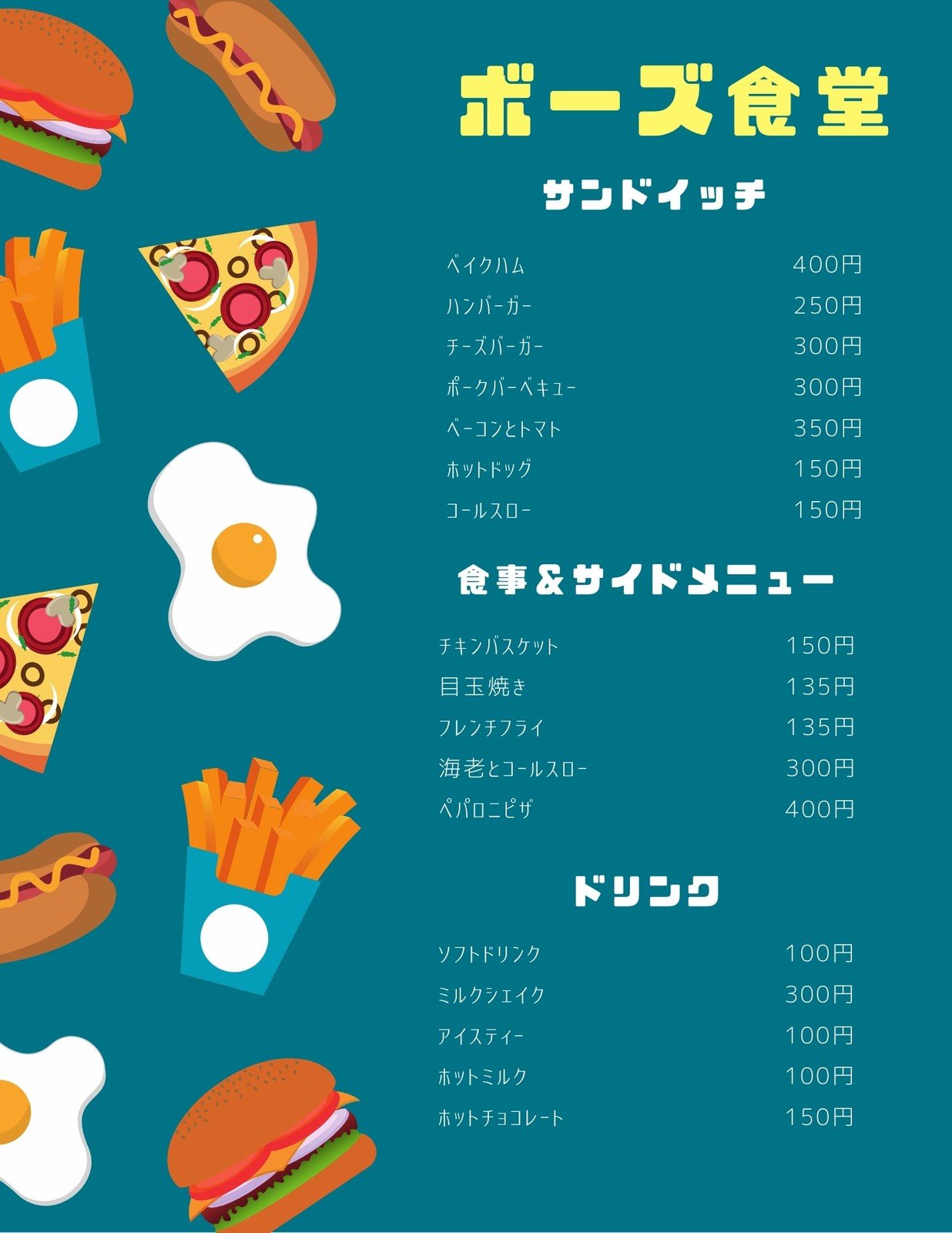 食堂・定食屋・アメリカンダイナーのメニューテンプレートでおしゃれなメニュー表デザインを無料で作成!Canva。