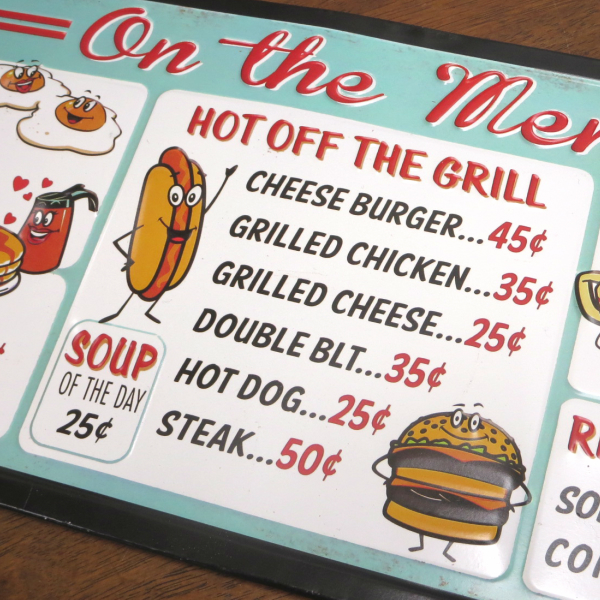 アメリカンダイナー☆メニューボード エンボス看板 ファストフードTIN SIGNディスプレイ用品。