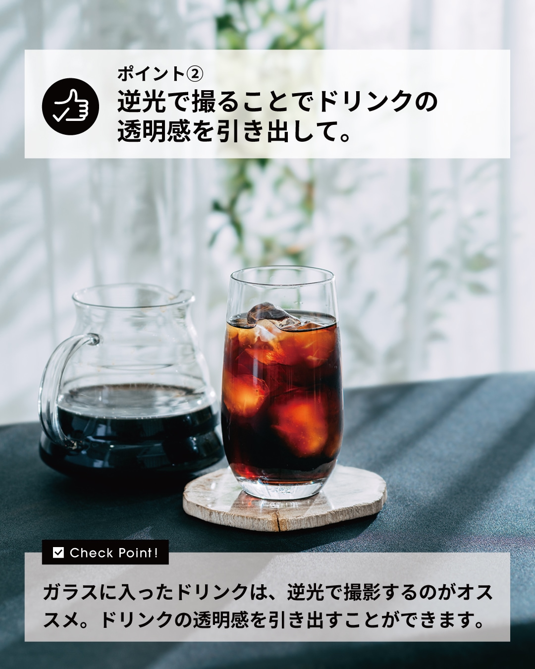 ドリンク写真の撮り方② 飲み物には透明感が必要。抜け感を出す撮影方法とは。