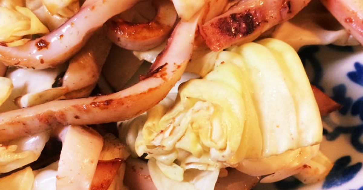 コストコ冷凍イカとキャベツのバターしょうゆ炒め。