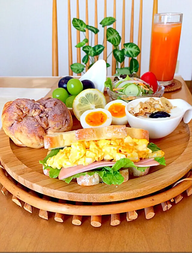 休日のゆったり朝ごはんが好き🍃 1週間お疲れ様でした🍒おうちごはんお昼ご飯献立専業主婦ワンプレートおしゃれごはんおうち カフェプレートごはんカフェ風ごはんワンプレート朝ごはん朝ごはんモーニングmorningサンドイッチ。