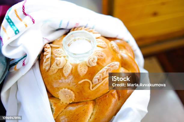ロシアのパン。新郎新婦のための結婚式の伝統的なパンと塩。焼きバターパン。甘い食べ物。伝統的なロシア料理。の写真素材・画像素材 Image154791064。