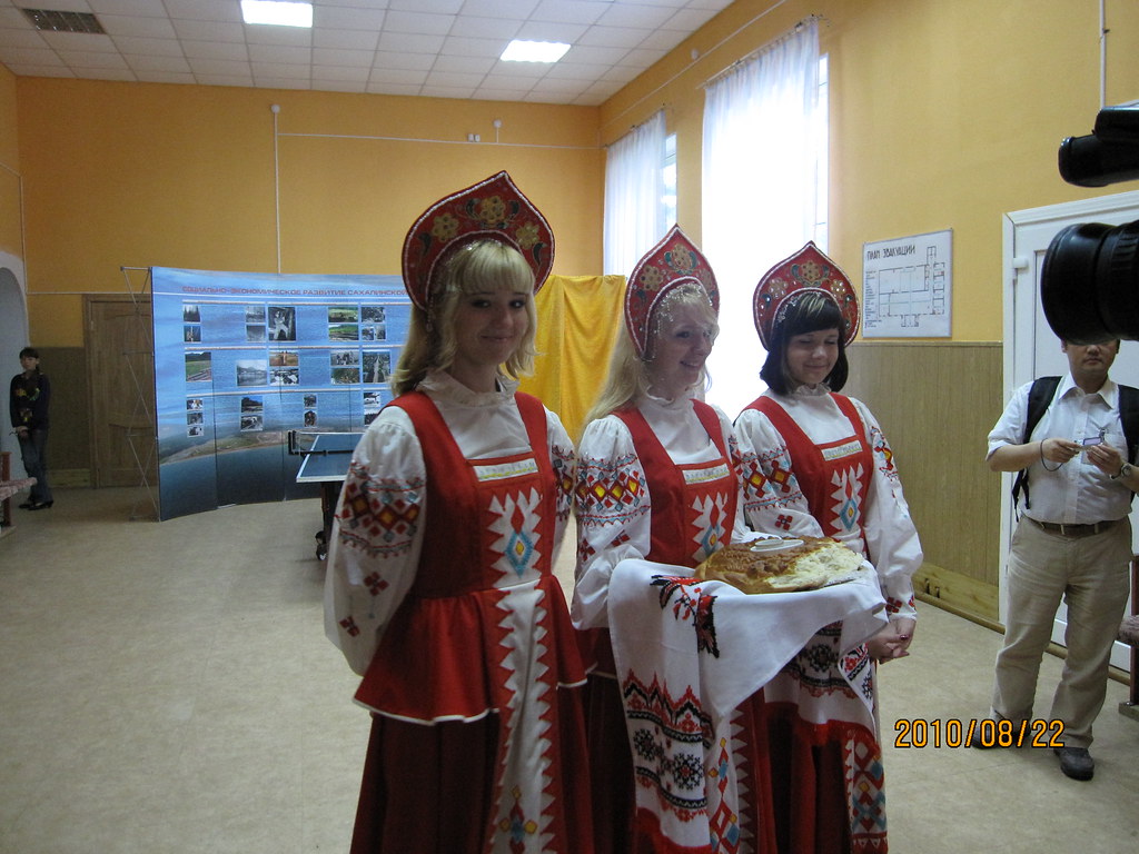 古釜布港でパンと塩の歓迎を受ける :北方領土~ロシア大統領が初訪問 写真特集:時事ドットコム。