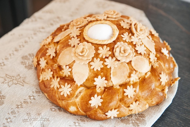 ウクライナの伝統的な休日のパン。ウクライナの装飾が施された焼きたてのパンを塩でテーブルに置きます。Premium写真。