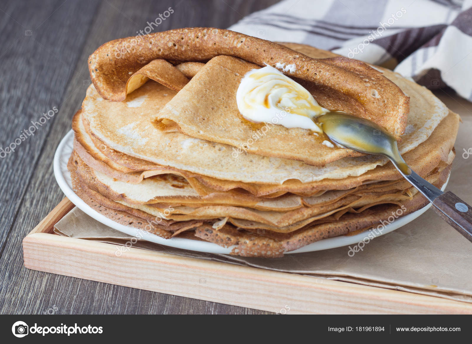 古典的なロシア薄いパンケーキ やサワー クリームと皿に塩キャラメル ソースのクレープのスタック 伝統的なロシアのパンケーキ週間 マースレニツァ —ストック写真 © porosolka_balt181961894。