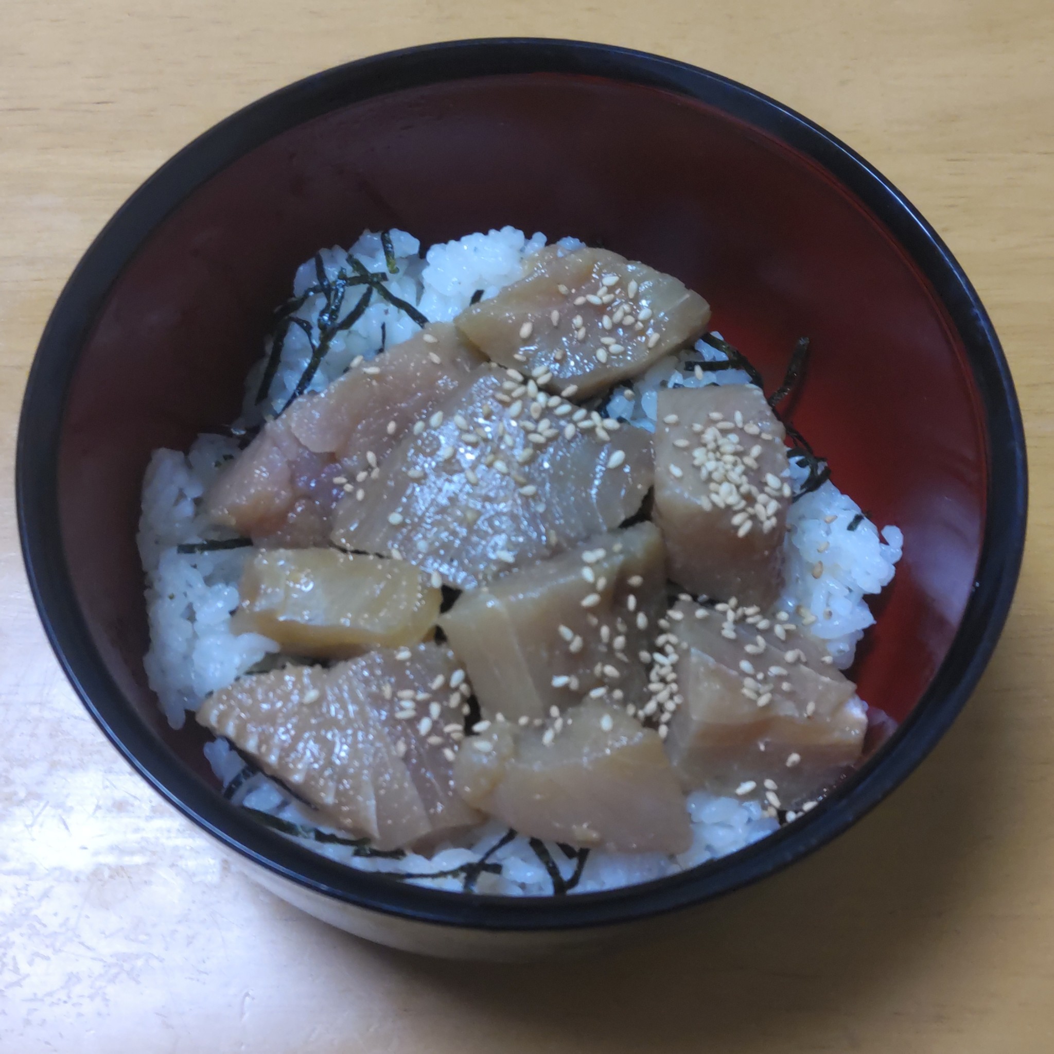 ごま油でおいしい~びんちょうマグロのぶつ切り漬け丼。