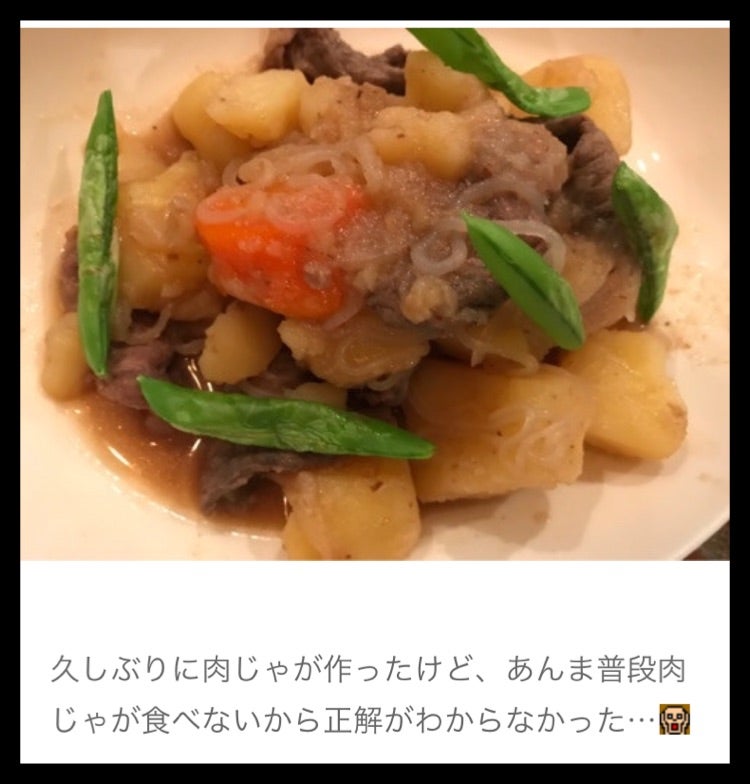 おうちじかんが増えて、手の込んだ料理に挑戦する人も多いのかな〜と思ったので、この前食べた肉じゃがのレシピのっけとくよ🙆🏻!お野菜をほぼ丸ごと使う肉じゃが! とろとろ、ほくほく、むっちり!だよ〜☺ よかったら作ってみてね🥺! もし作ったらろしめしろしぴ。