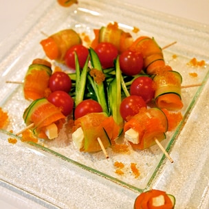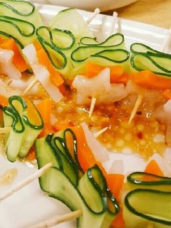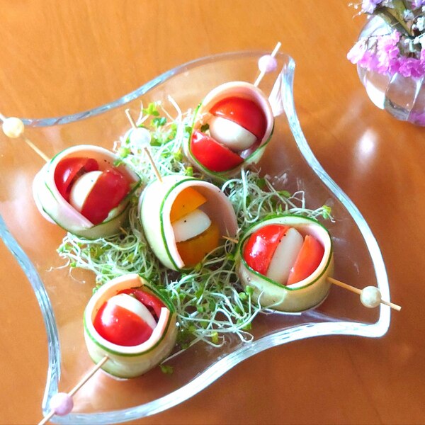ミニトマトとうずらのハムきゅうり巻きピンチョスꕤ୭。