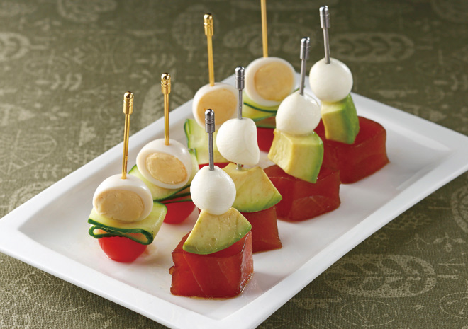 ピンチョス各種 うずらの卵と生ハム、エビ、砂肝、鯵のオイルサーディン Koi-Chef Blog。