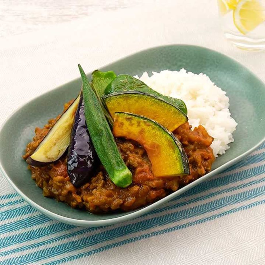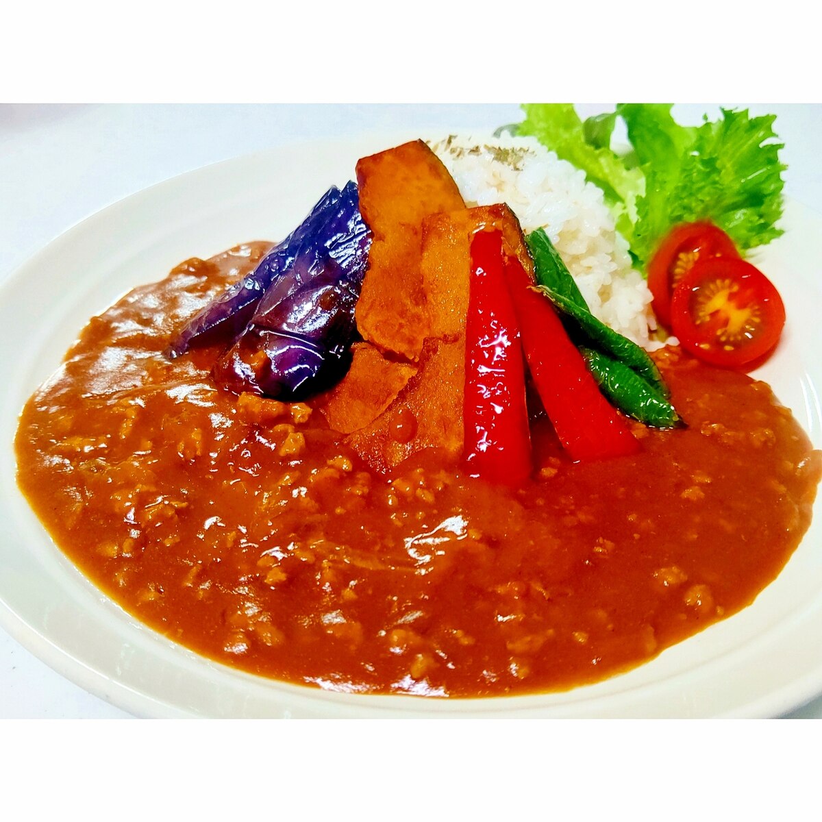 トマトキーマカレー 夏野菜の素揚げトッピング。