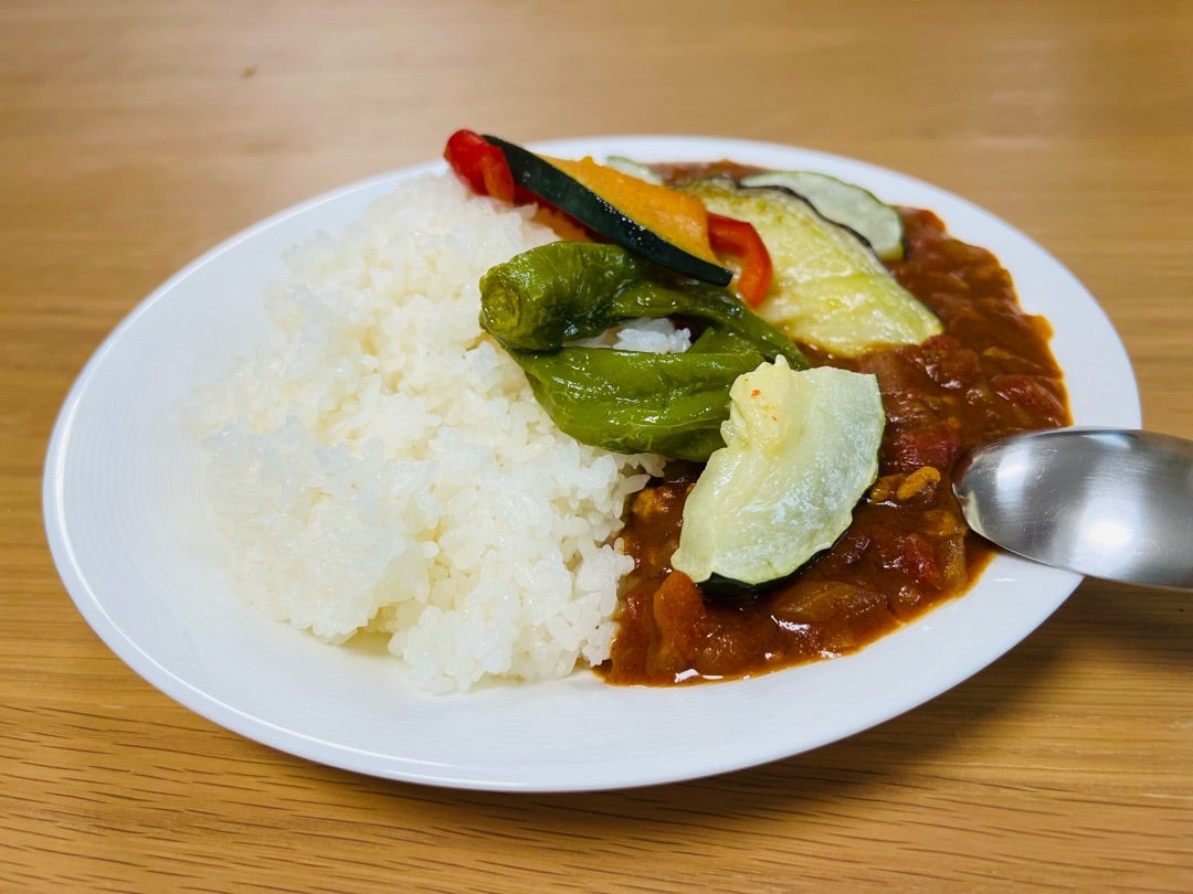 2日目カレー、今日は夏野菜の素揚げをトッピングで •̀ᴗ•́ و ̑̑ : noleの「もぐもぐ日記」。